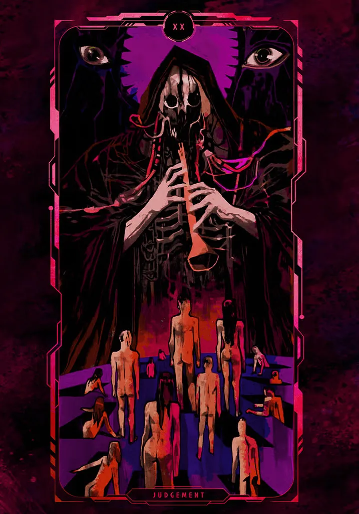 Face your destiny with the Judgment tarot card art from Cyberpunk 2077. A powerful symbol of awakening and rebirth. Shop Cyberpunk 2077 Judgment Tarot Card Art Poster & level up your space.