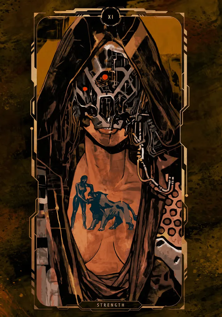 Embrace inner power with the Strength tarot card art from Cyberpunk 2077. A symbol of courage in the cyberpunk future. Shop Cyberpunk 2077 Strength Tarot Card Art Poster & level up your space.
