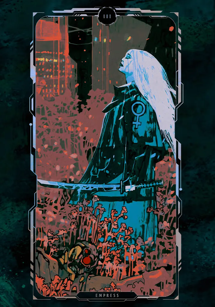 Celebrate abundance with The Empress tarot card art from Cyberpunk 2077. A beautiful fusion of mysticism and cyberpunk aesthetics. Shop Cyberpunk 2077 The Empress Tarot Card Art Poster & level up your space.