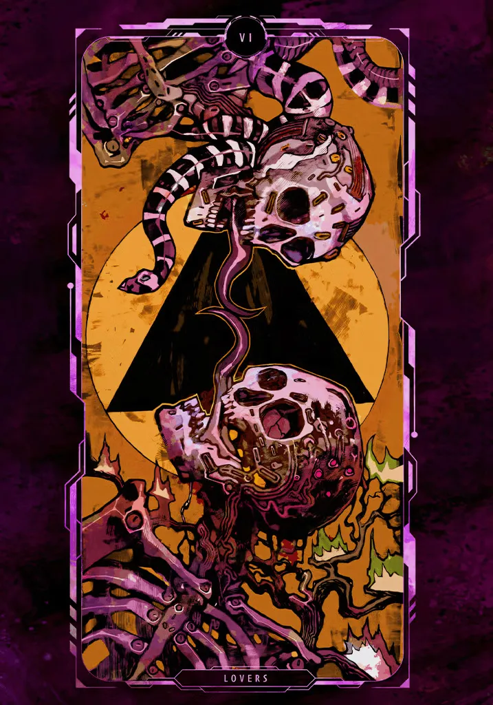 Experience connection with The Lovers tarot card art from Cyberpunk 2077. A beautiful representation of choice and relationships. Shop Cyberpunk 2077 The Lovers Tarot Card Art Poster & level up your space.