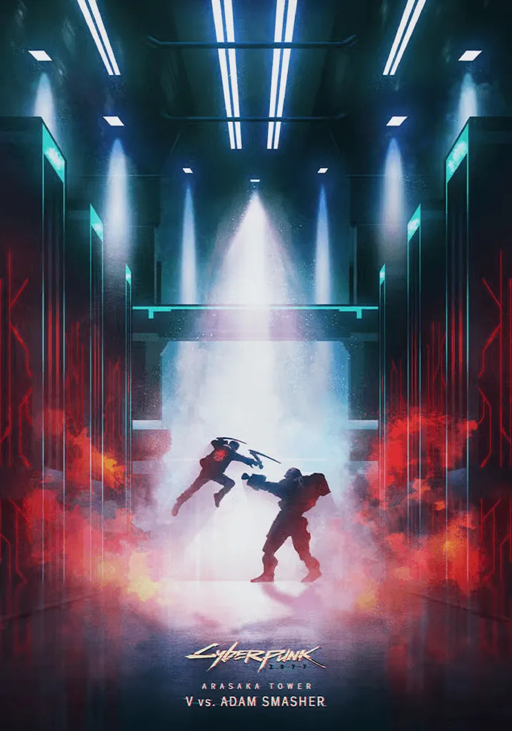 Transform Your Space: Elevate your gaming setup with this exclusive Cyberpunk 2077 V versus Adam Smasher Battle Poster! Designed for die-hard fans, this stunning print brings the heat of the intense gaming right to your walls.