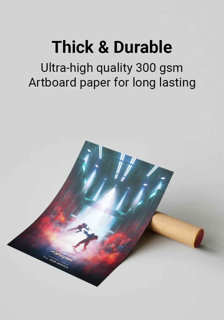 Premium Quality: Cyberpunk 2077 posters are printed on ultra-thick 300gsm, glossy art-board paper for a premium feel and lasting durability. The perfect addition to any gaming room, bedroom, or office. Available in multiple sizes to fit your space.