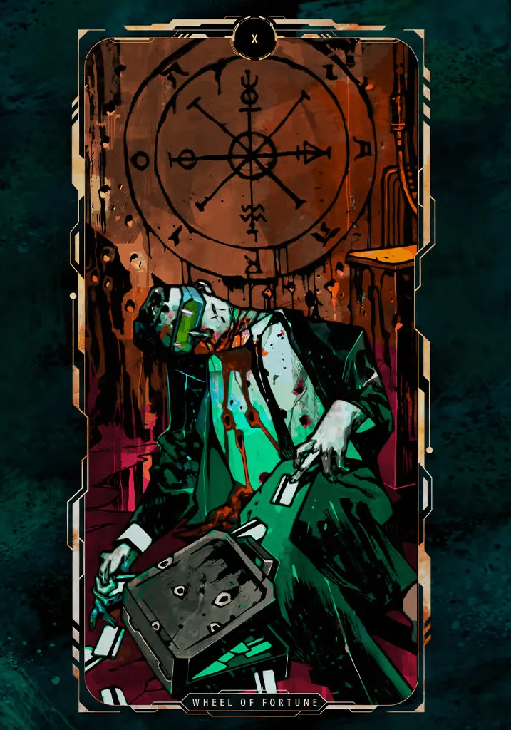 Embrace destiny with the Wheel of Fortune tarot art from Cyberpunk 2077. Perfect for fans of fate and fortune symbolism. Shop Cyberpunk 2077 Wheel of Fortune Tarot Art Poster & level up your space.