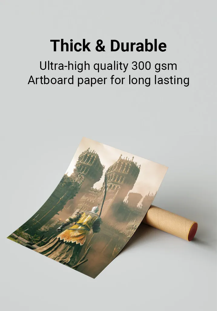 This Elden Ring poster features high-resolution artwork printed on 300gsm thick, glossy paper to ensure vibrant colors & long-lasting durability.