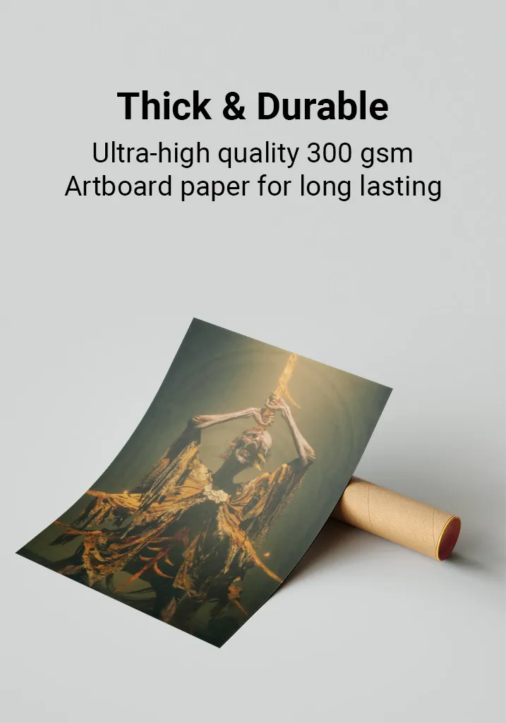 This Elden Ring poster features high-resolution artwork printed on 300gsm thick, glossy paper to ensure vibrant colors & long-lasting durability.
