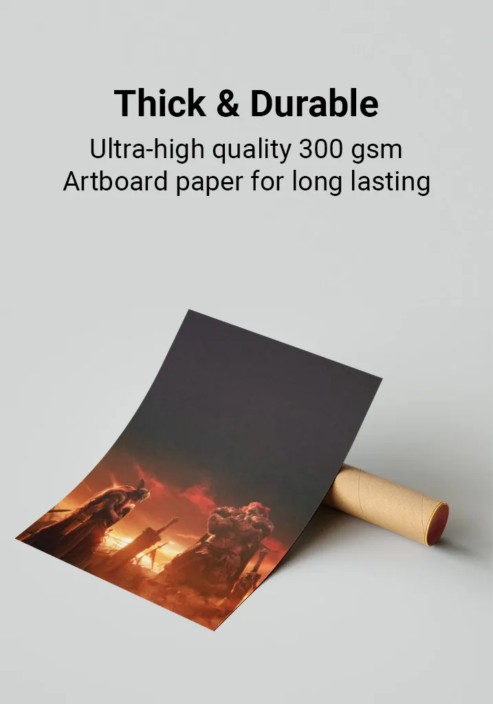 This Elden Ring poster features high-resolution artwork printed on 300gsm thick, glossy paper to ensure vibrant colors & long-lasting durability.