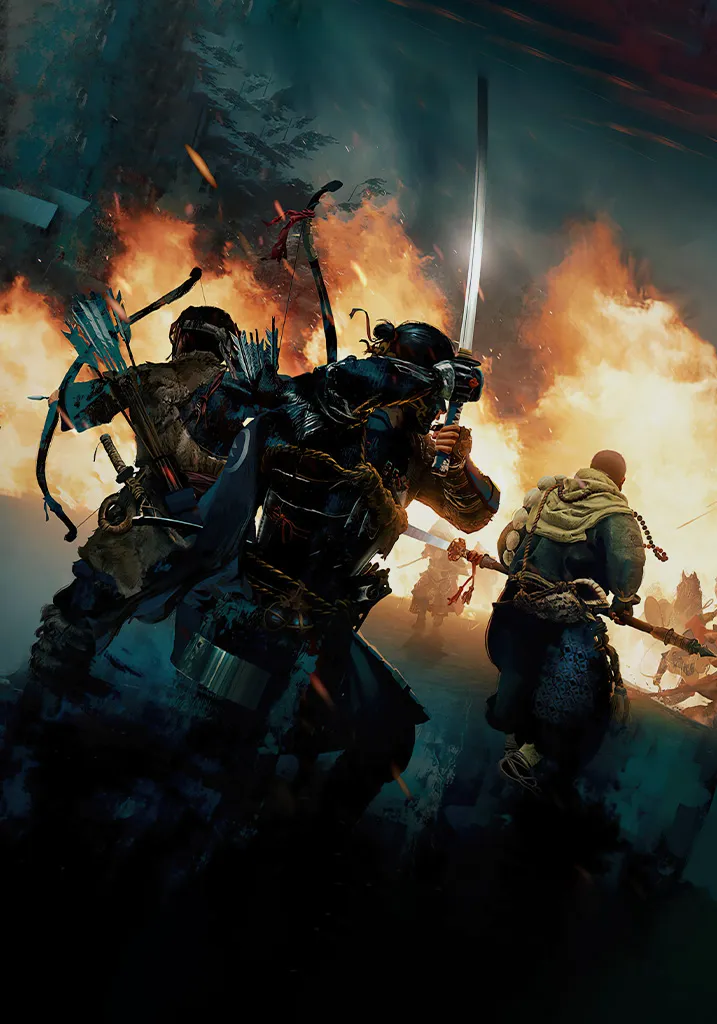 Epic invasion battle scene from Ghost of Tsushima featuring intense combat. Showcases the clash between samurai and Mongol forces. Shop Ghost of Tsushima Epic Invasion Battle Poster & level up your space.