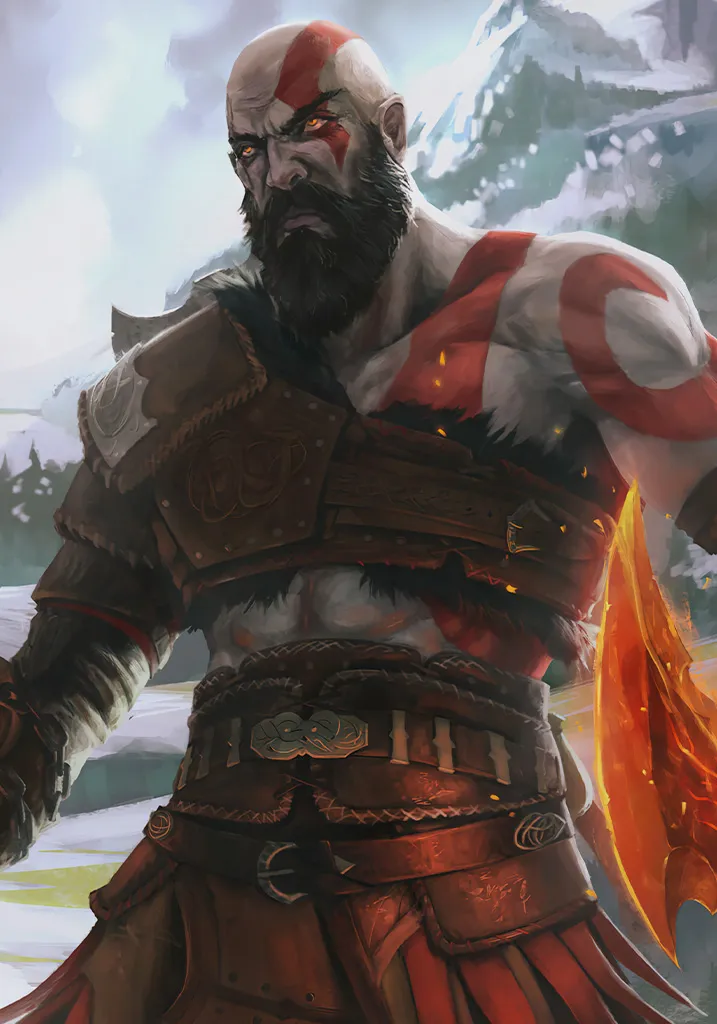 Stylized artistic interpretation of Kratos in his Ragnarök appearance with dramatic lighting. Shop God of War Ragnarok Artistic Portrait Poster & level up your space.