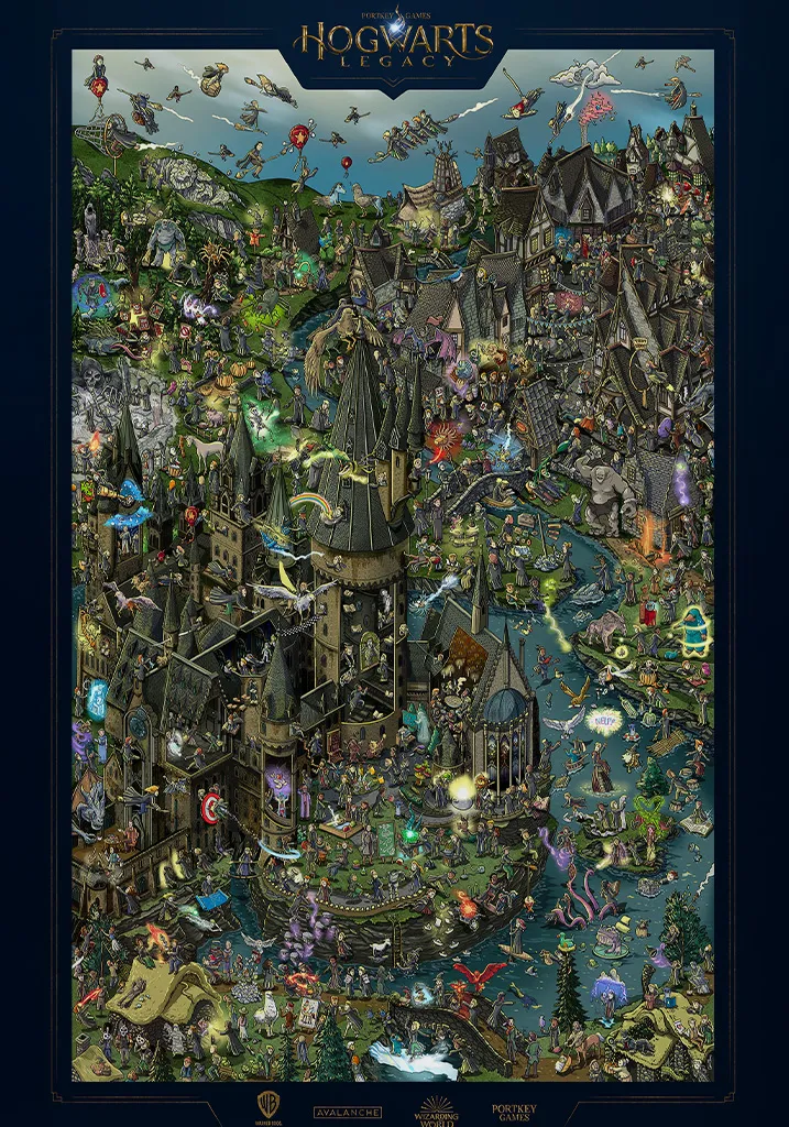 Immerse yourself in the magical world with this comprehensive Hogwarts Legacy poster featuring iconic locations, characters, and magical creatures from the acclaimed game. Perfect for gaming room decor. Shop Hogwarts Legacy Complete Collection Official Game Art Poster & level up your space.