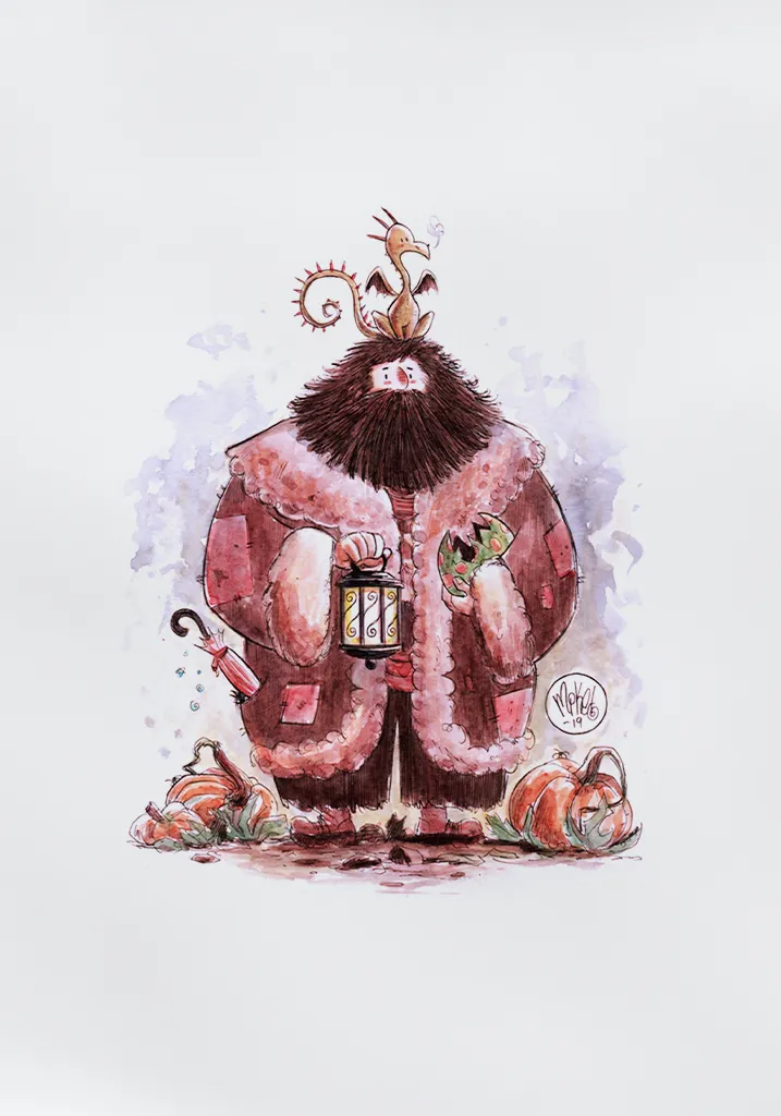 Charming illustration of Hagrid with baby dragon Norbert in Mike Maihack’s distinctive art style, capturing a heartwarming moment from the wizarding world. Shop Hogwarts Legacy Hagrid and Baby Dragon Illustrated Art Poster & level up your space.